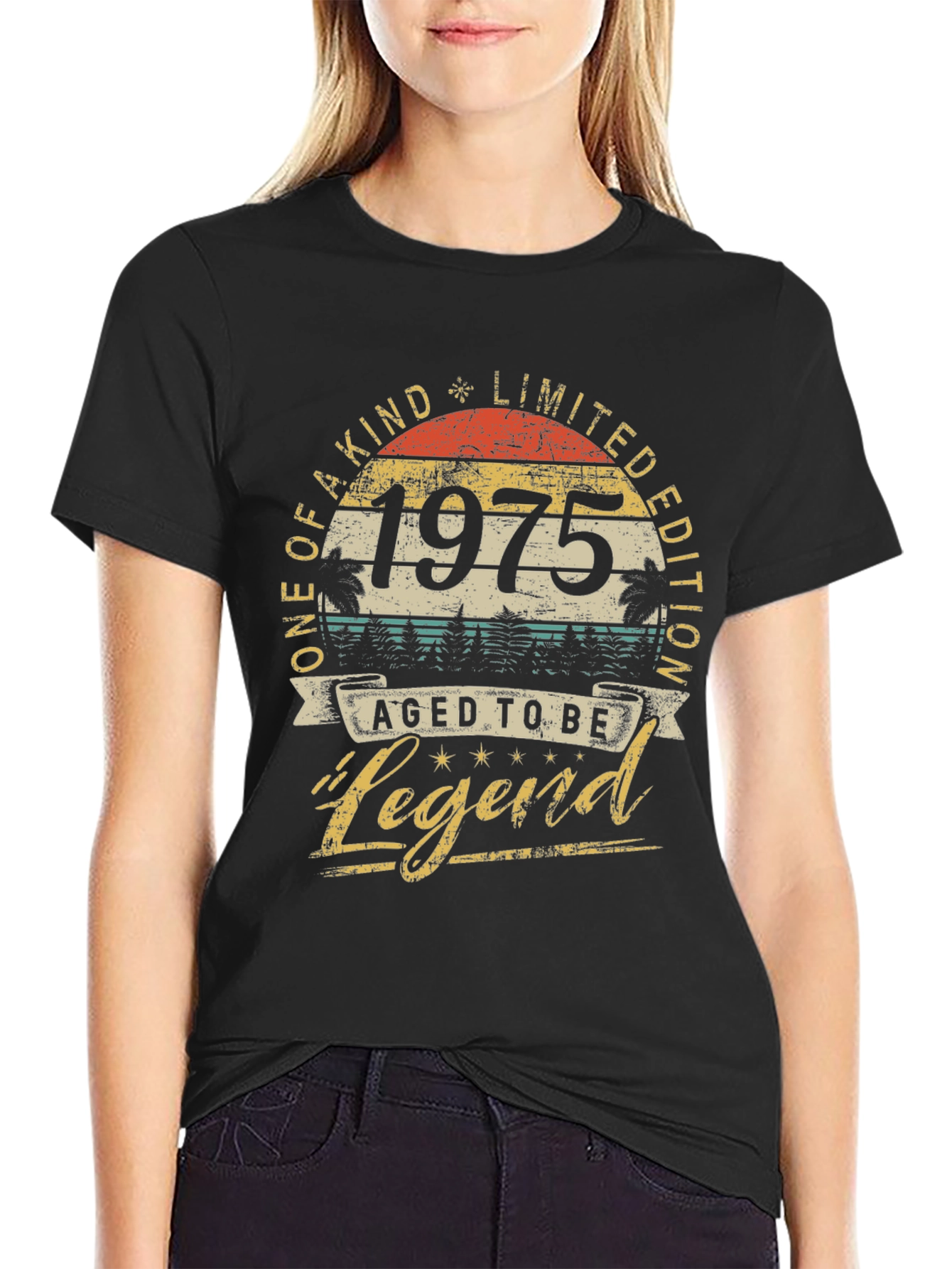 Celebrate a milestone year with this vintage-inspired black t-shirt. The design features the year "1975" in a retro-style font, set against a distressed sunset graphic with palm trees. Encircling the year are the words "ONE OF A KIND * LIMITED EDITION", adding an exclusive touch. Below, a banner proclaims "AGED TO BE Legend", completing the nostalgic theme. Crafted from comfortable cotton, this tee offers a relaxed fit. Perfect for birthdays, anniversaries, or anyone proud of their birth year, this shirt is a stylish way to showcase your unique history.