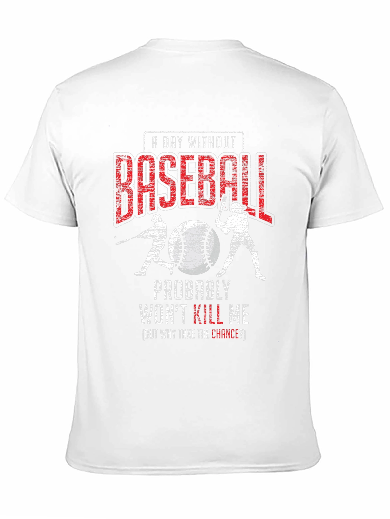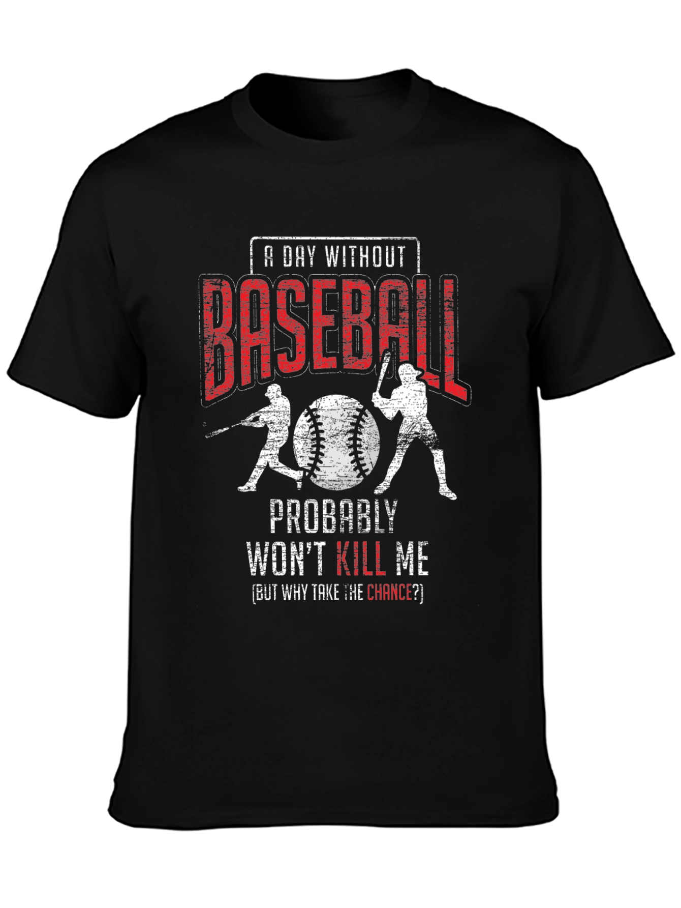 Show your love for America's favorite pastime with this unique graphic t-shirt. The design features the witty phrase "A Day Without Baseball Probably Won't Kill Me (But Why Take the Chance?)", alongside a baseball graphic and silhouette of a player in action. Made from a comfortable and breathable fabric, this tee is perfect for casual wear, baseball games, or just relaxing with friends. It's a great conversation starter and makes a fantastic gift for baseball fans of all ages. Add a touch of humor and personality to your wardrobe with this one-of-a-kind baseball-themed t-shirt.