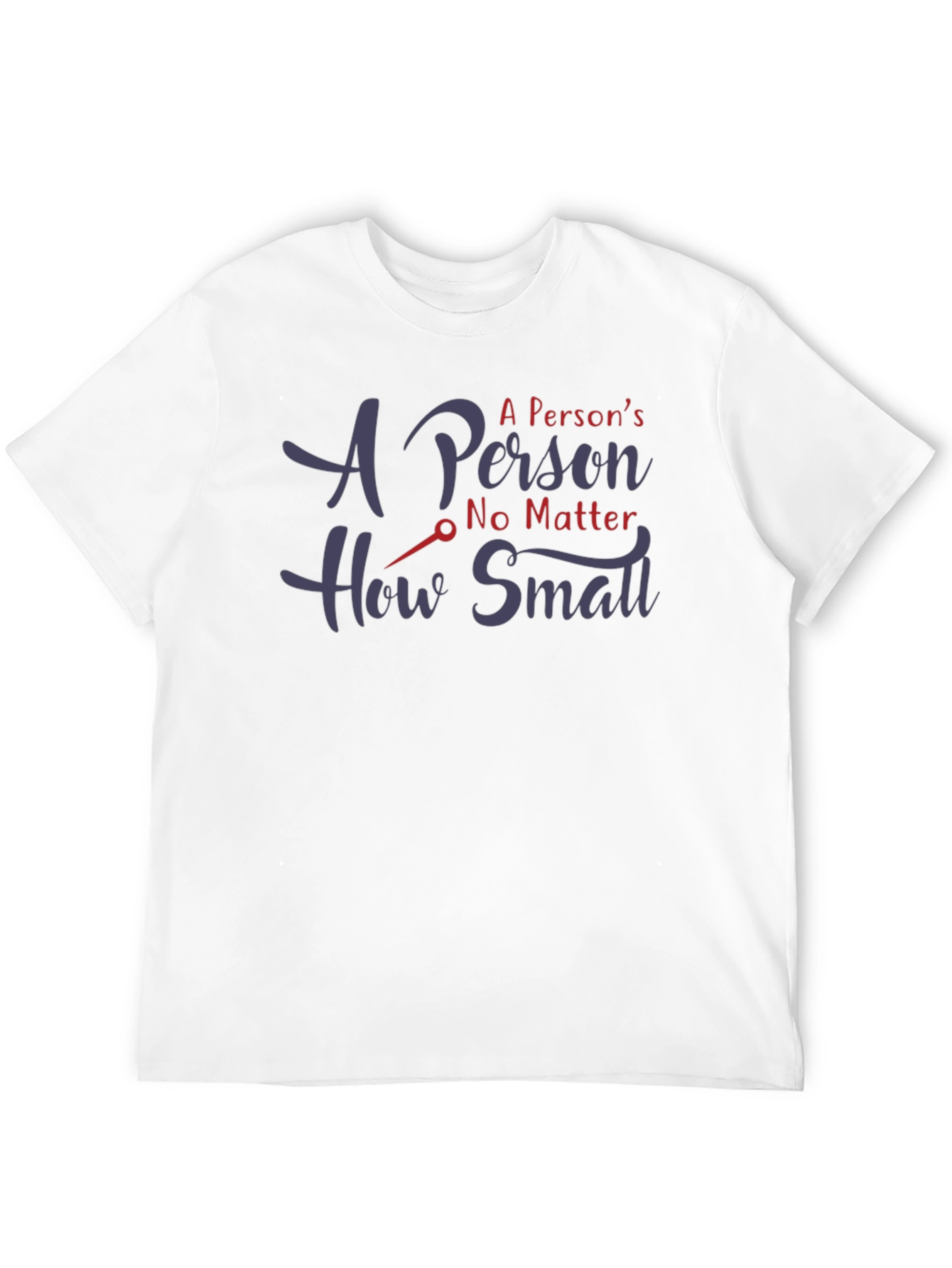 This classic black t-shirt features a stylish and inspiring design. The words "A Person's No Matter How Small" are prominently displayed in a combination of purple and red lettering, creating a visually appealing contrast against the dark background. The shirt appears to be made of a soft and comfortable material, perfect for casual wear. The design suggests a message of inclusivity and value, making it a meaningful addition to any wardrobe. Wear it to express your personal values or as a conversation starter. The versatile style is ideal for everyday use, from running errands to relaxing at home.