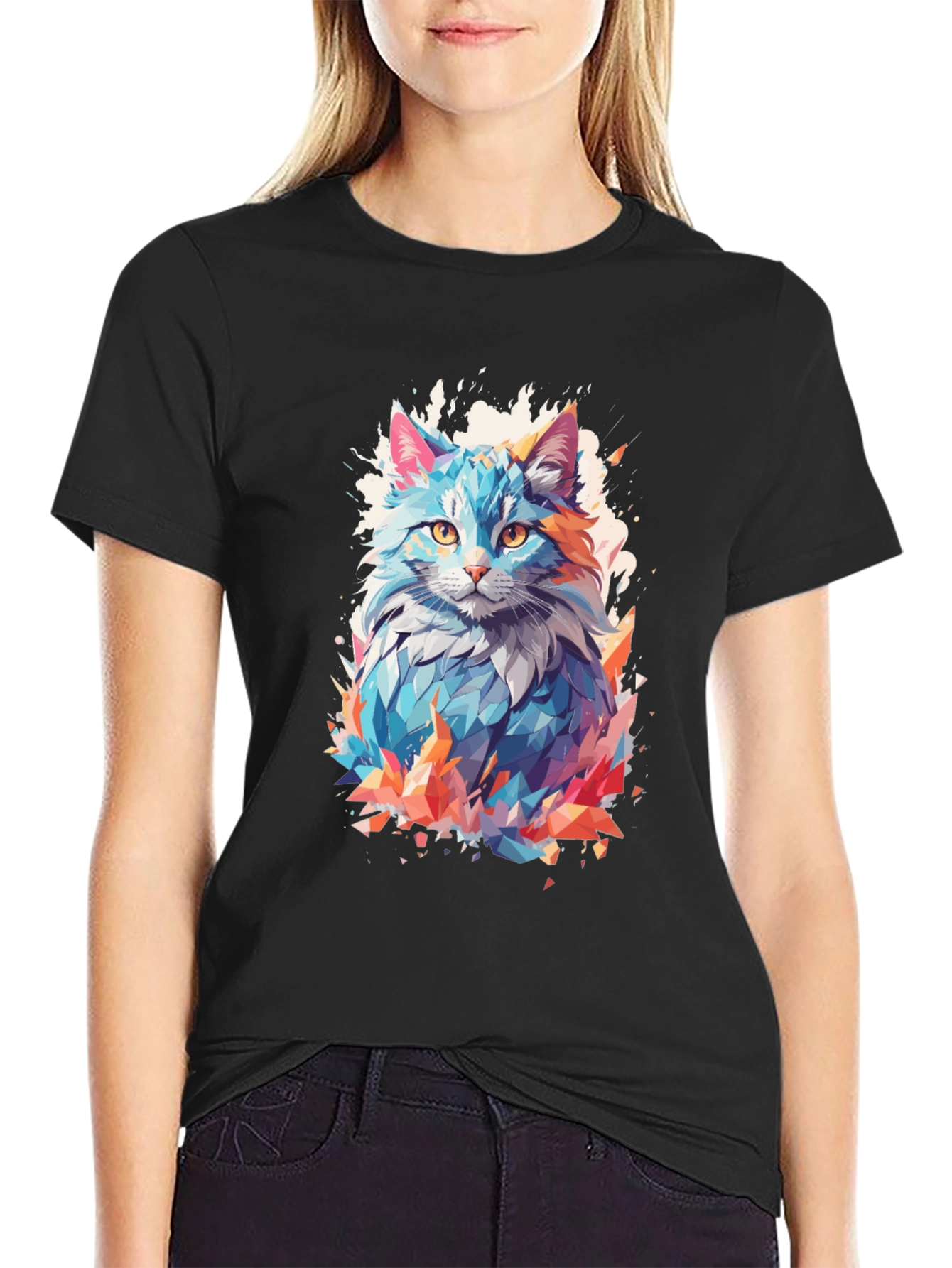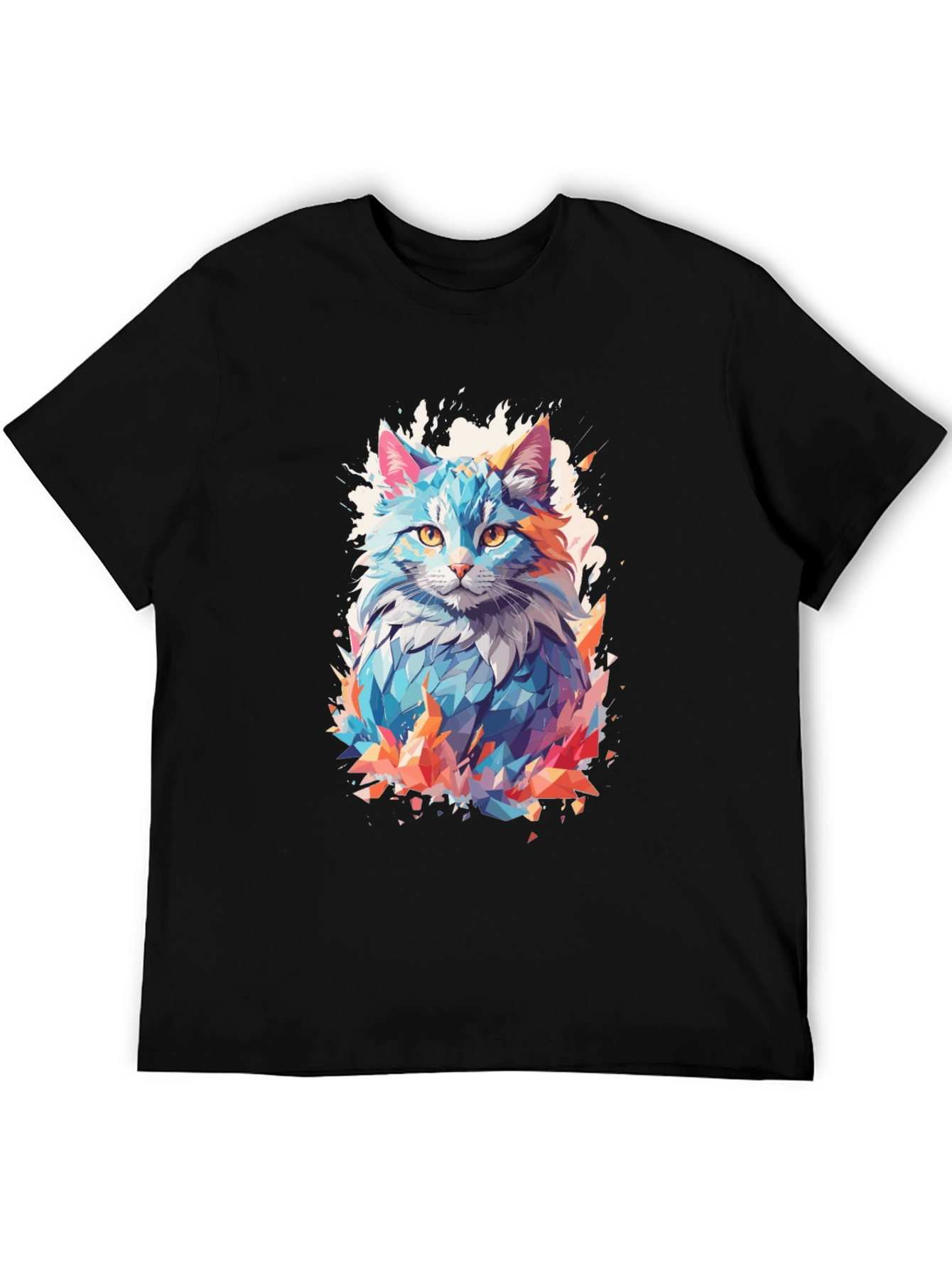 Show off your unique style with this eye-catching black t-shirt. Featuring a vibrant, abstract cat graphic with a cool polygonal design and splash art style, this tee is sure to turn heads. The colorful, geometric cat print pops against the classic black background. Made from a comfortable fabric, this shirt is perfect for casual wear, making a statement at social events, or expressing your love for cats. A must-have addition to any modern wardrobe, combining comfort and bold artistic flair.