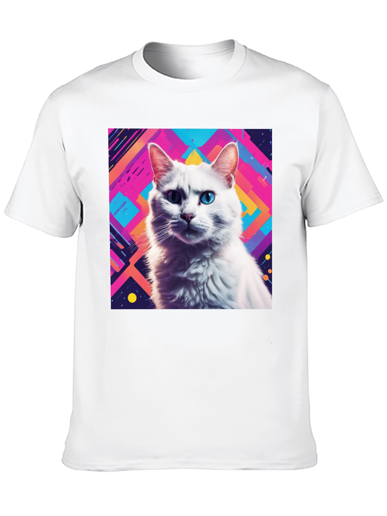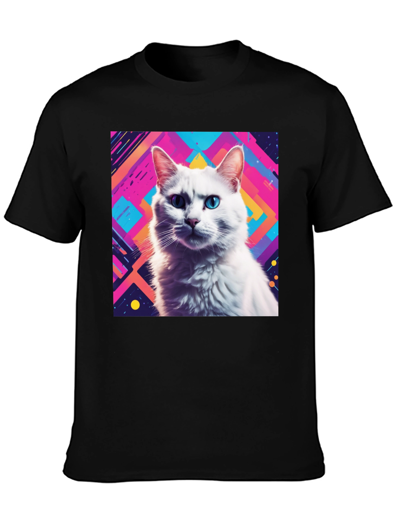 Make a statement with this unique black t-shirt featuring a vibrant, abstract cat graphic. The design showcases a white cat with striking blue eyes set against a colorful geometric background, perfect for adding a pop of personality to your wardrobe. This tee is made from a comfortable fabric, ideal for everyday wear. Its unisex design makes it a versatile choice for anyone. Whether you're a cat lover or appreciate eye-catching art, this tee is sure to turn heads. Dress it up or down – it’s great for casual outings, concerts, or simply lounging at home. Add this standout piece to your collection and showcase your unique style.