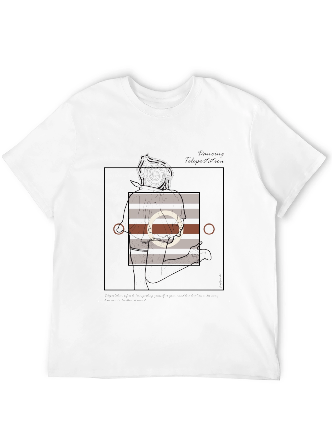 Elevate your casual style with this modern graphic print T-shirt. The design features an abstract striped pattern framed within a square, accentuated by minimalist circular elements. The subtle outline of a figure adds an artistic touch. Crafted from a comfortable, likely breathable fabric, this black tee offers a relaxed fit suitable for everyday wear. Perfect for expressing your unique style, this T-shirt is ideal for casual outings, creative workspaces, or simply lounging in comfort. Pair it with jeans, chinos, or shorts for a effortlessly stylish look.