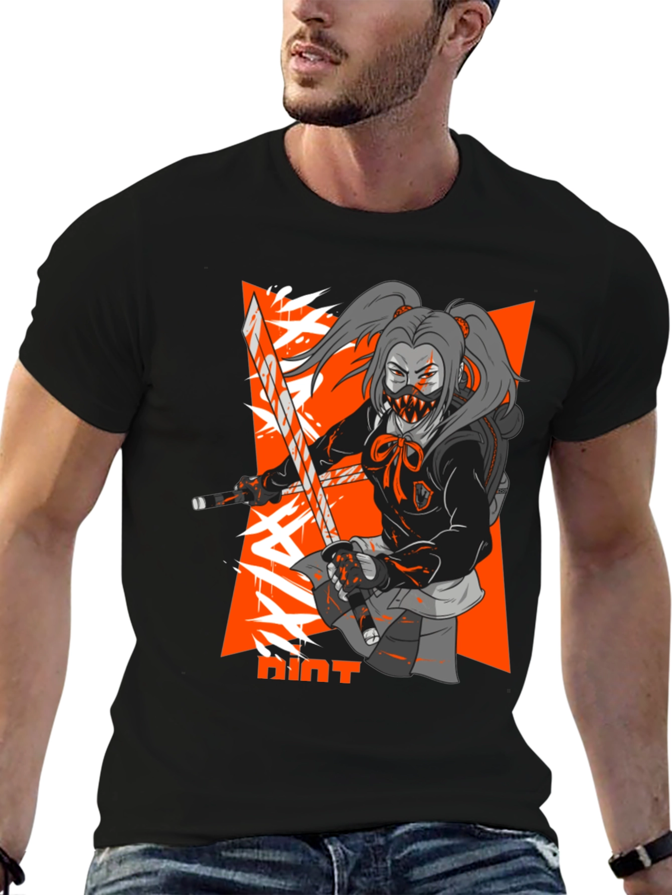 This cool black t-shirt features a bold graphic of an anime-style ninja girl. The design includes crossed swords, sharp lettering, and an orange-toned background that makes the design pop. The edgy and unique design is printed on a soft-looking black fabric. The character has grey hair styled in pigtails and a mask for a street-style ninja aesthetic. This shirt is perfect for anime fans, streetwear enthusiasts, or anyone who wants to add a unique piece to their wardrobe. Wear it casually, to a convention, or any place you want to stand out.