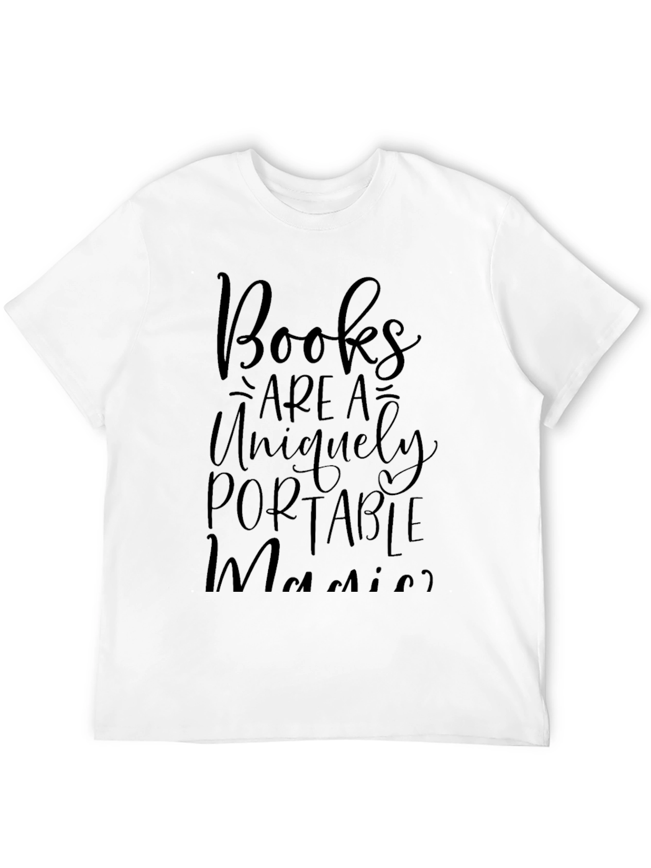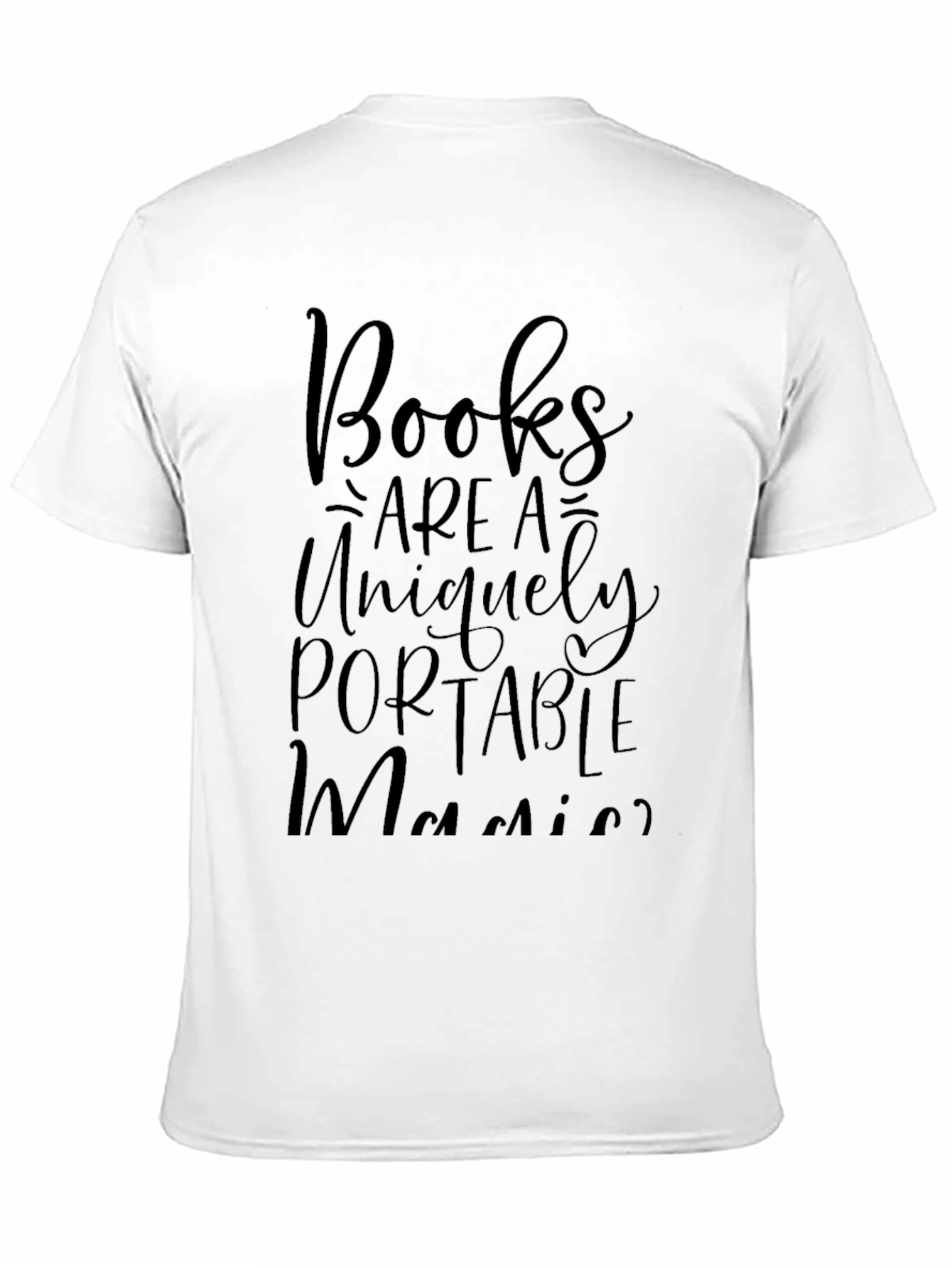 Show your love for reading with this stylish black t-shirt. The shirt features a creative text design that reads "Books are a uniquely portable magic." The message is printed in a flowing, elegant script, adding a touch of sophistication. Made from comfortable fabric, this tee is perfect for casual wear, book club meetings, or library visits. This is a great way to express your love for reading. The t-shirt will also make a thoughtful gift for your favorite bookworm.
