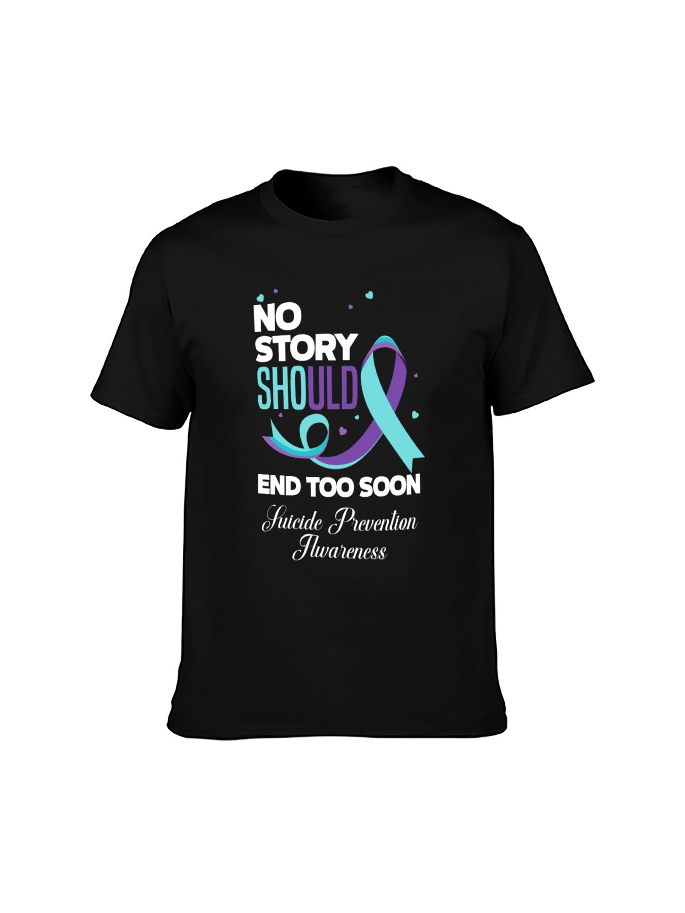 Meaningful Design: Featuring a teal and purple awareness ribbon paired with the heartfelt slogan “No Story Should End Too Soon,” this tee is a visual testament to your commitment to suicide prevention and mental health support. It’s a conversation starter that invites empathy, understanding, and action.
