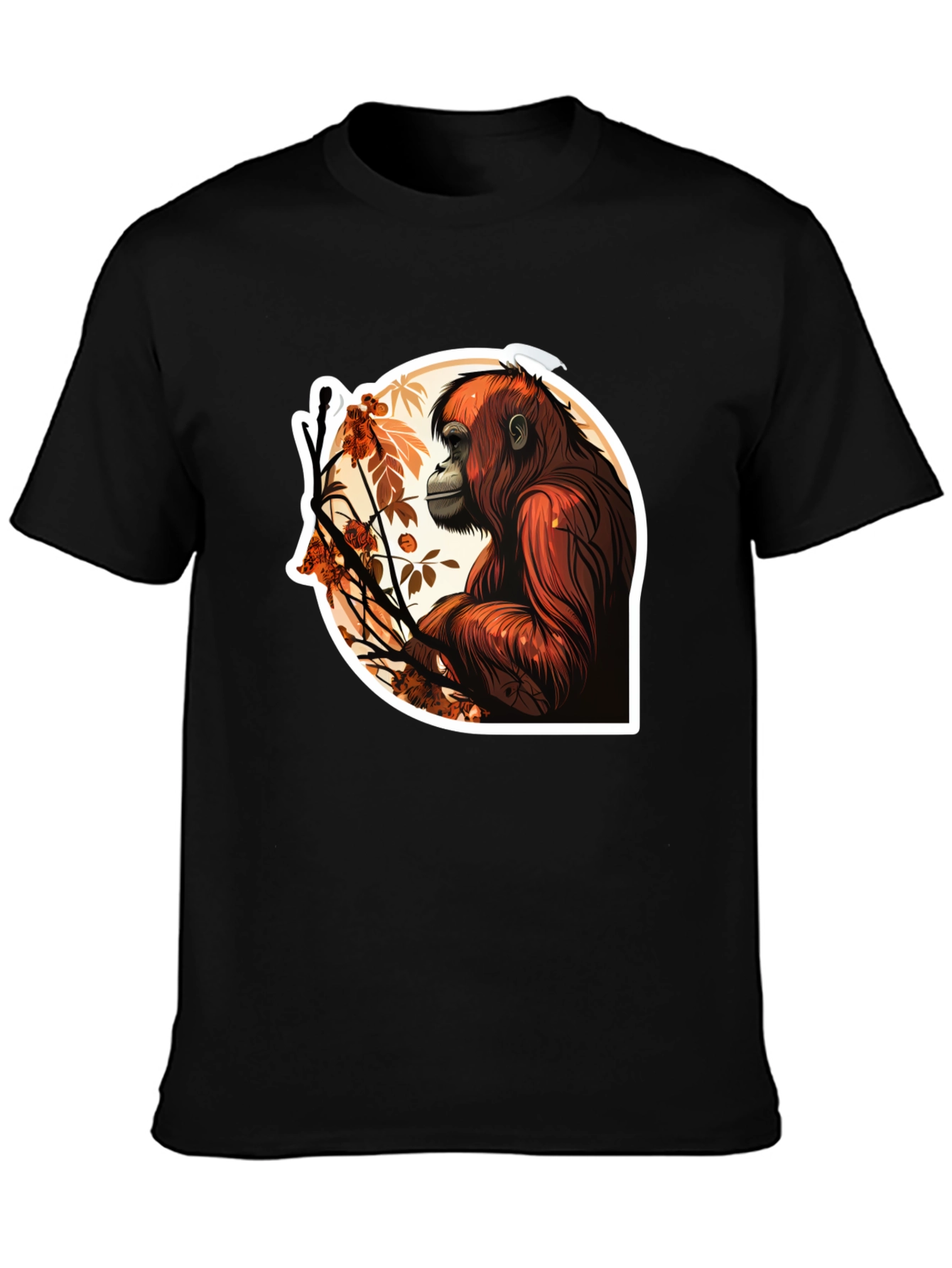 Elevate your casual style with this unique black t-shirt, featuring a striking orangutan graphic. The design showcases a detailed illustration of an orangutan amidst stylized leaves, set against a clean backdrop. Made from comfortable fabric, this tee offers both style and comfort. Its eye-catching design makes it a perfect conversation starter, ideal for everyday wear or casual outings. Show off your love for wildlife with this distinctive animal-themed t-shirt.