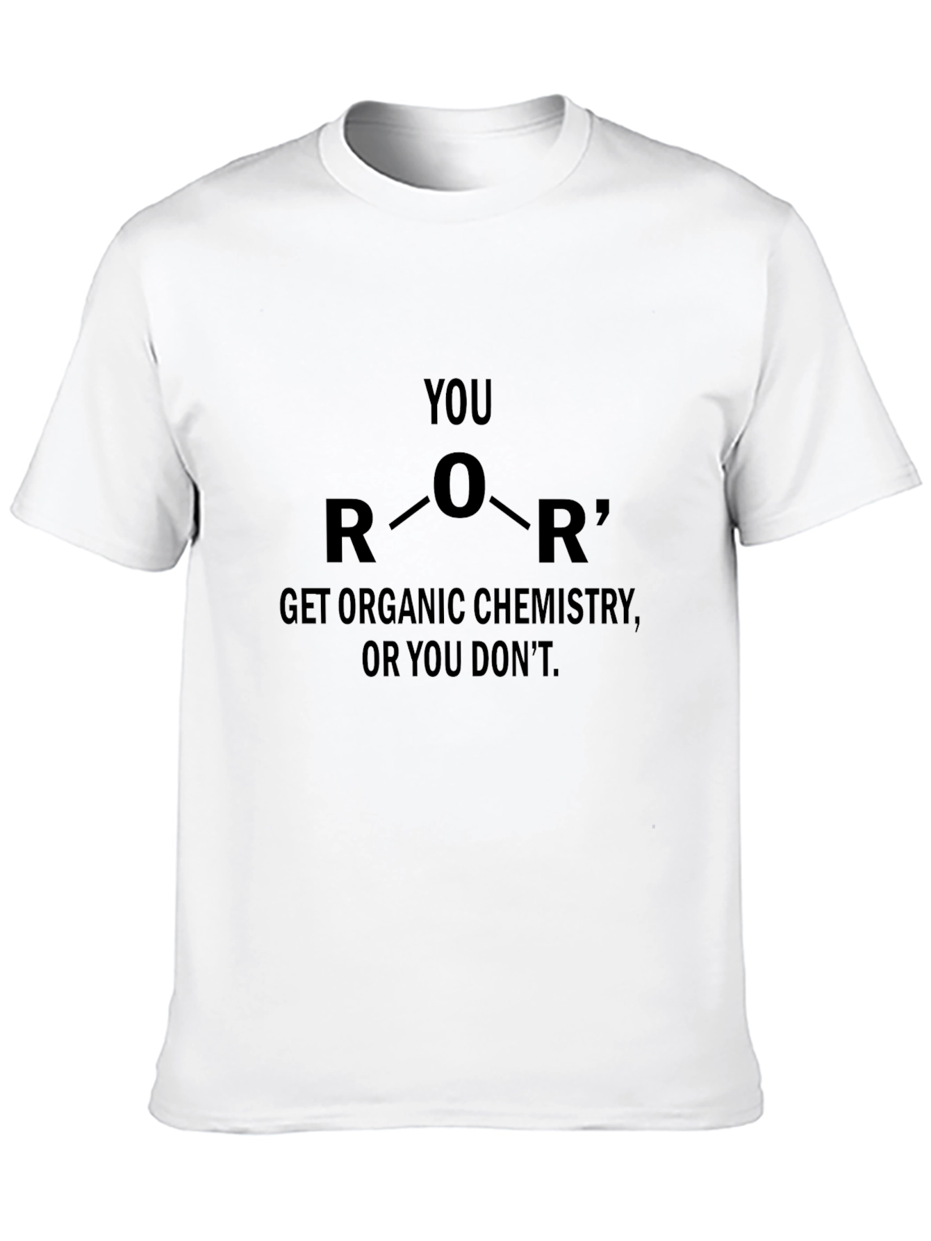 Show off your love for science with this unique black t-shirt. The design features a fun play on words for those who understand organic chemistry. With the phrase 'You R-O-R' and 'Get organic chemistry, or you don't,' it's sure to bring a smile to fellow science enthusiasts. Made from a comfortable fabric, this tee is perfect for everyday wear, classroom settings, or science-themed events. The bold print stands out, making it a great conversation starter and a fun way to express your passion for chemistry. A must-have for students, teachers, and science lovers alike!