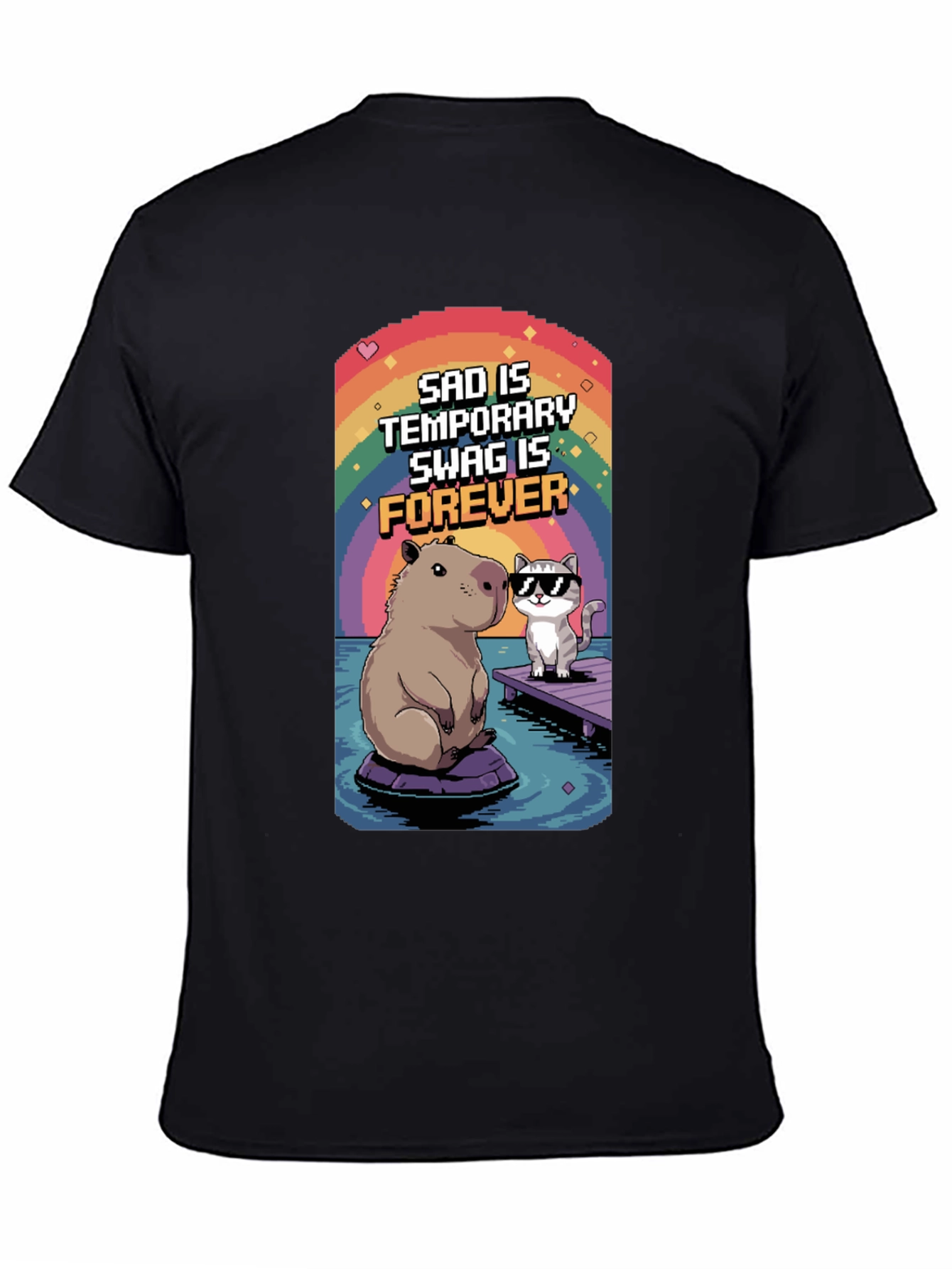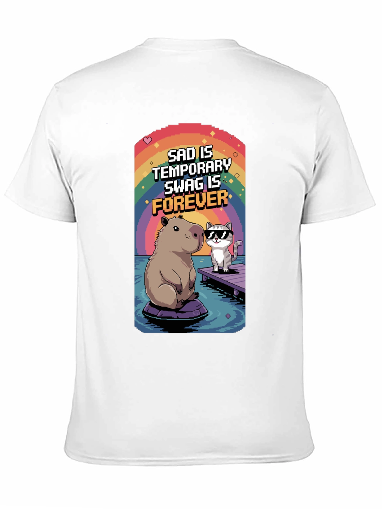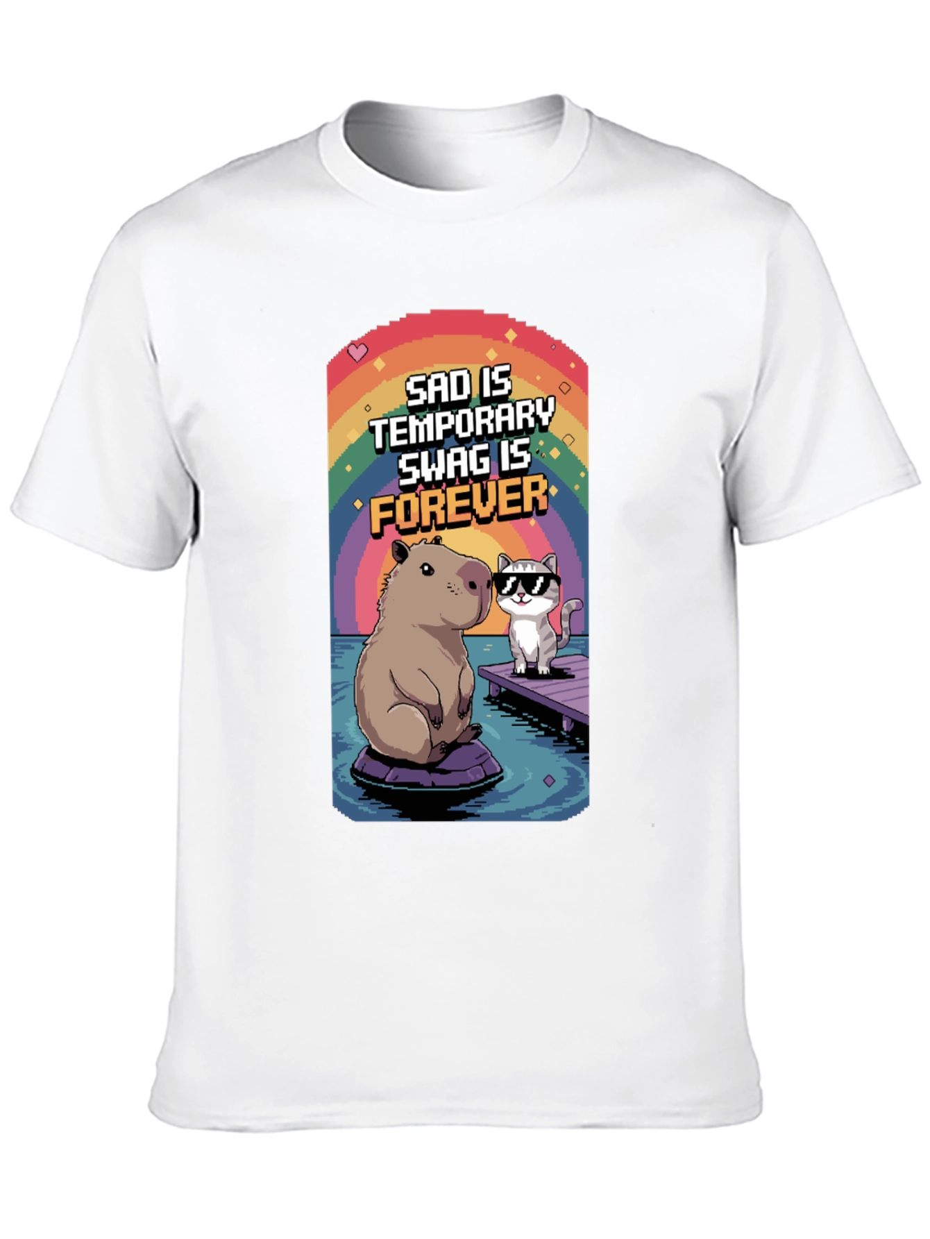 This t-shirt features a pixel art design of a capybara and a cat wearing sunglasses in front of a rainbow. The text "Sad is Temporary Swag is Forever" is displayed above the characters. The shirt is a classic fit and can be worn in any casual setting to show off your positive and stylish attitude. Made of a soft, comfortable fabric, this tee is perfect for everyday wear. Express your unique personality with this eye-catching and trendy design.