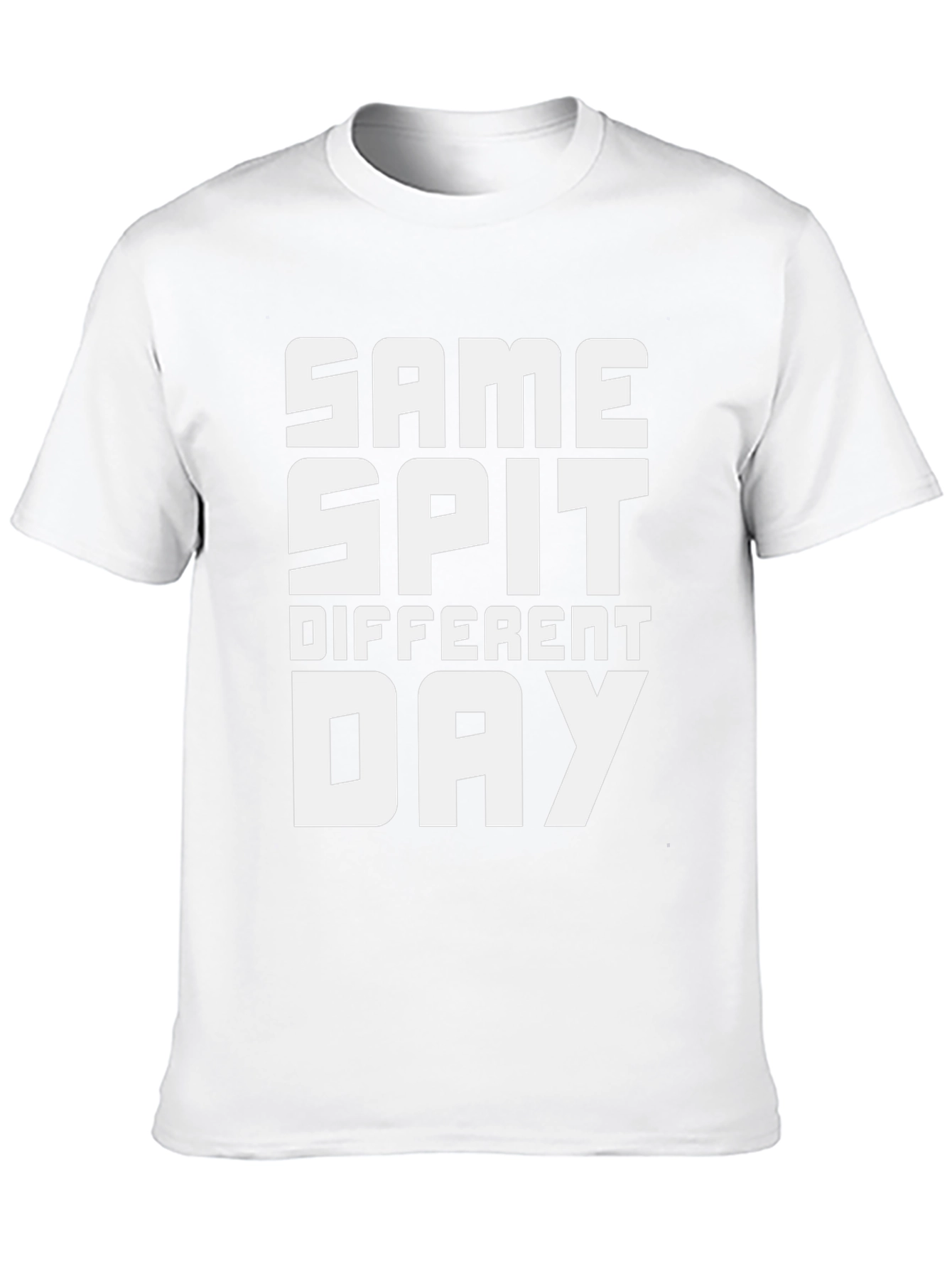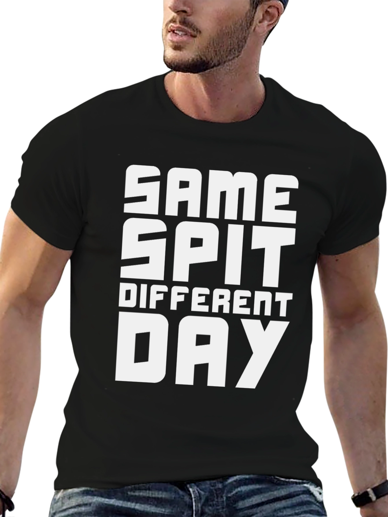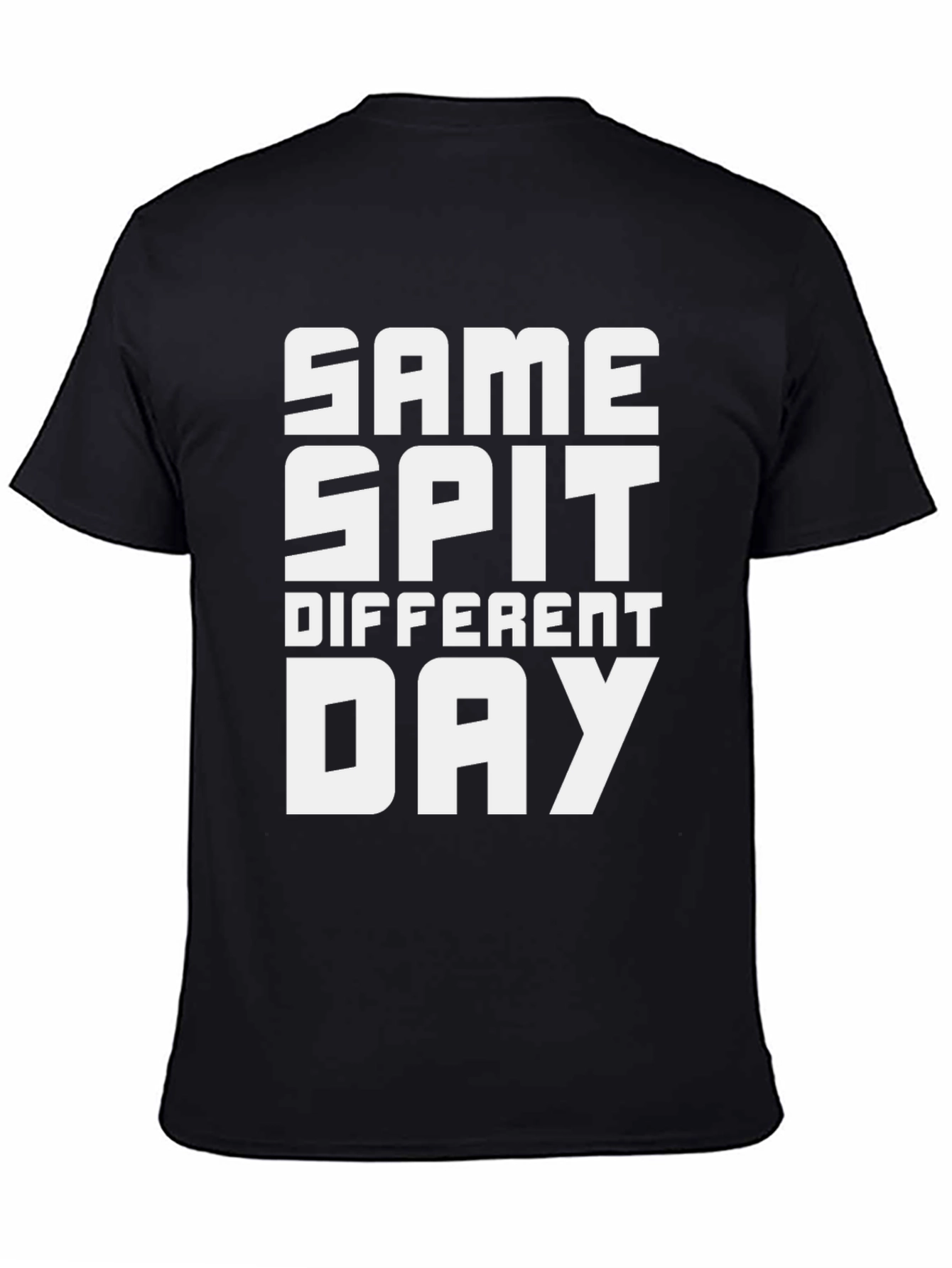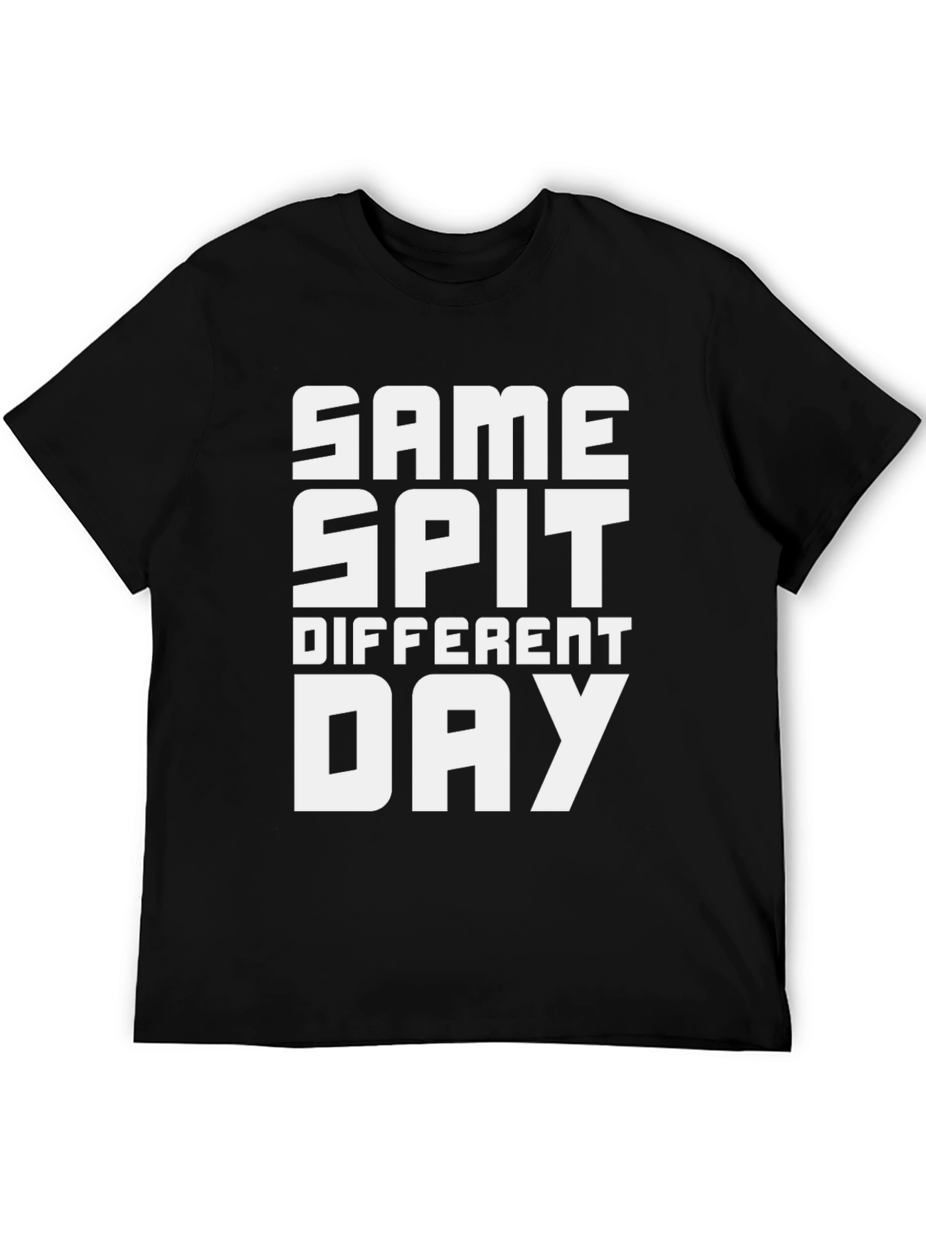 This black t-shirt features a bold white graphic that reads "SAME SPIT DIFFERENT DAY" in a stacked, block-letter design. The tee has a classic crew neck and short sleeves, offering a comfortable and casual fit. Made from what appears to be soft, breathable cotton, this shirt is perfect for everyday wear. The amusing slogan adds a touch of humor and individuality to your wardrobe. Ideal for relaxed outings, casual gatherings, or simply lounging at home, this tee is a great conversation starter and a fun way to express your unique style. Pair it with jeans, shorts, or your favorite casual bottoms for a complete look.