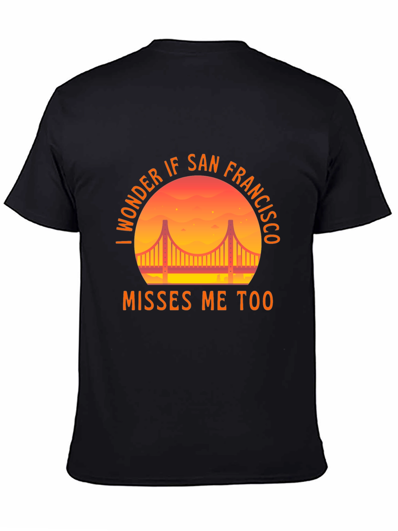 This trendy black t-shirt features a unique graphic design that will appeal to anyone who loves San Francisco. The design includes a sunset, a bridge, and the text "I WONDER IF SAN FRANCISCO MISSES ME TOO". The shirt appears to be made from a soft and comfortable fabric, making it perfect for everyday wear. This t-shirt is a great way to show your love for the city or as a reminder of a special trip.