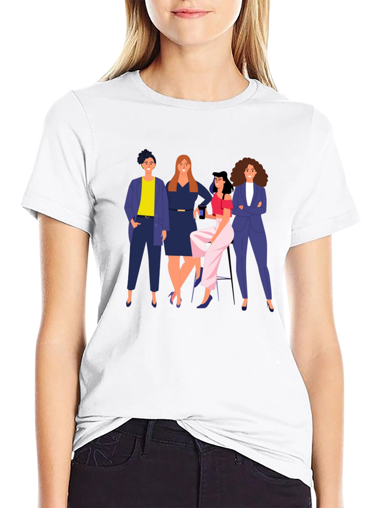 Show off your support for women with this eye-catching black graphic tee! The design features a colorful illustration of four stylish women in business attire, projecting confidence and power. The shirt appears to be made from a soft, comfortable material perfect for everyday wear. It is a great way to make a statement and start conversations. Pair it with jeans for a casual look or dress it up with a blazer for a professional setting. Ideal for rallies, office events, or simply expressing your values. Get yours today and wear your message with pride!