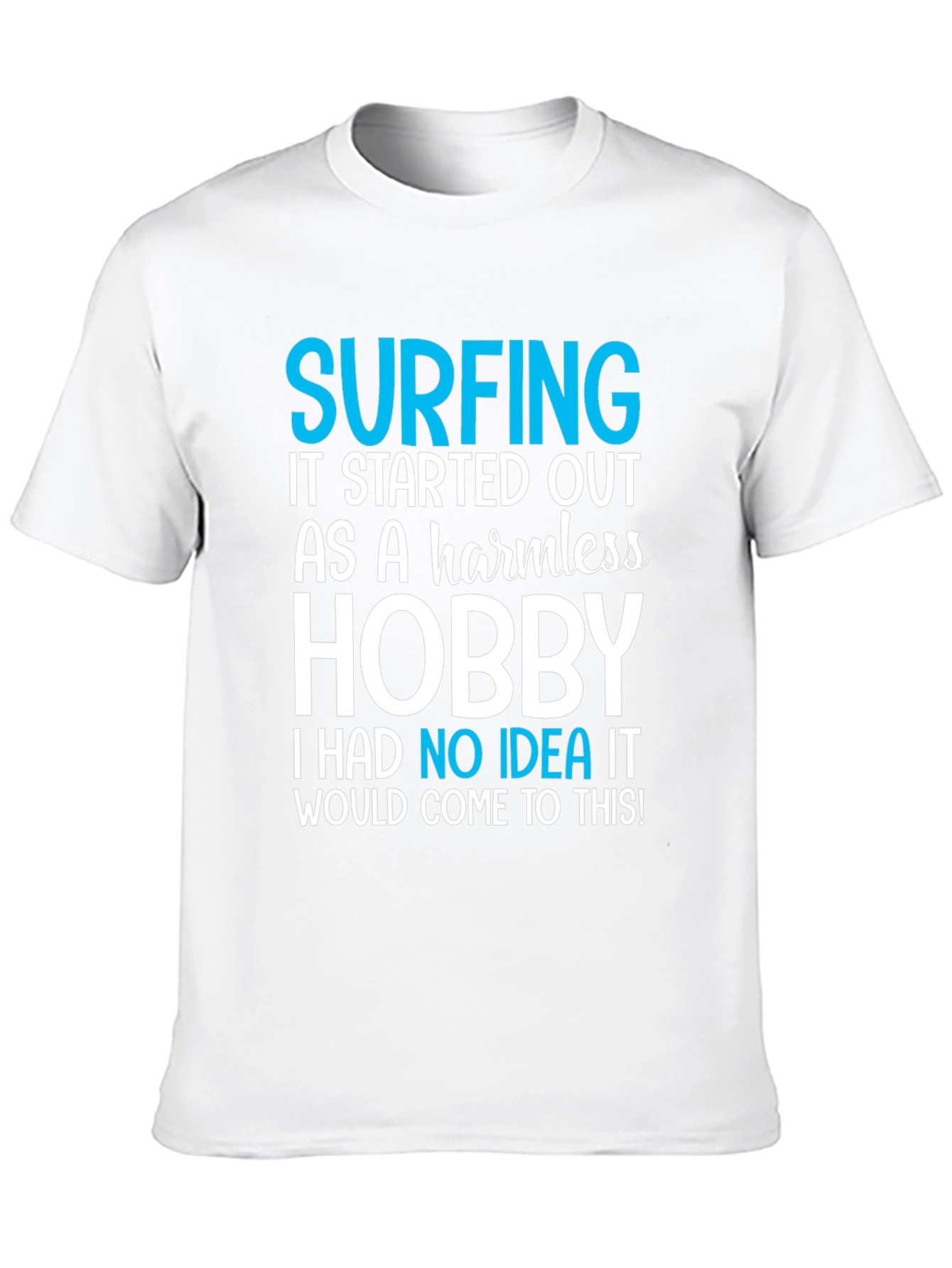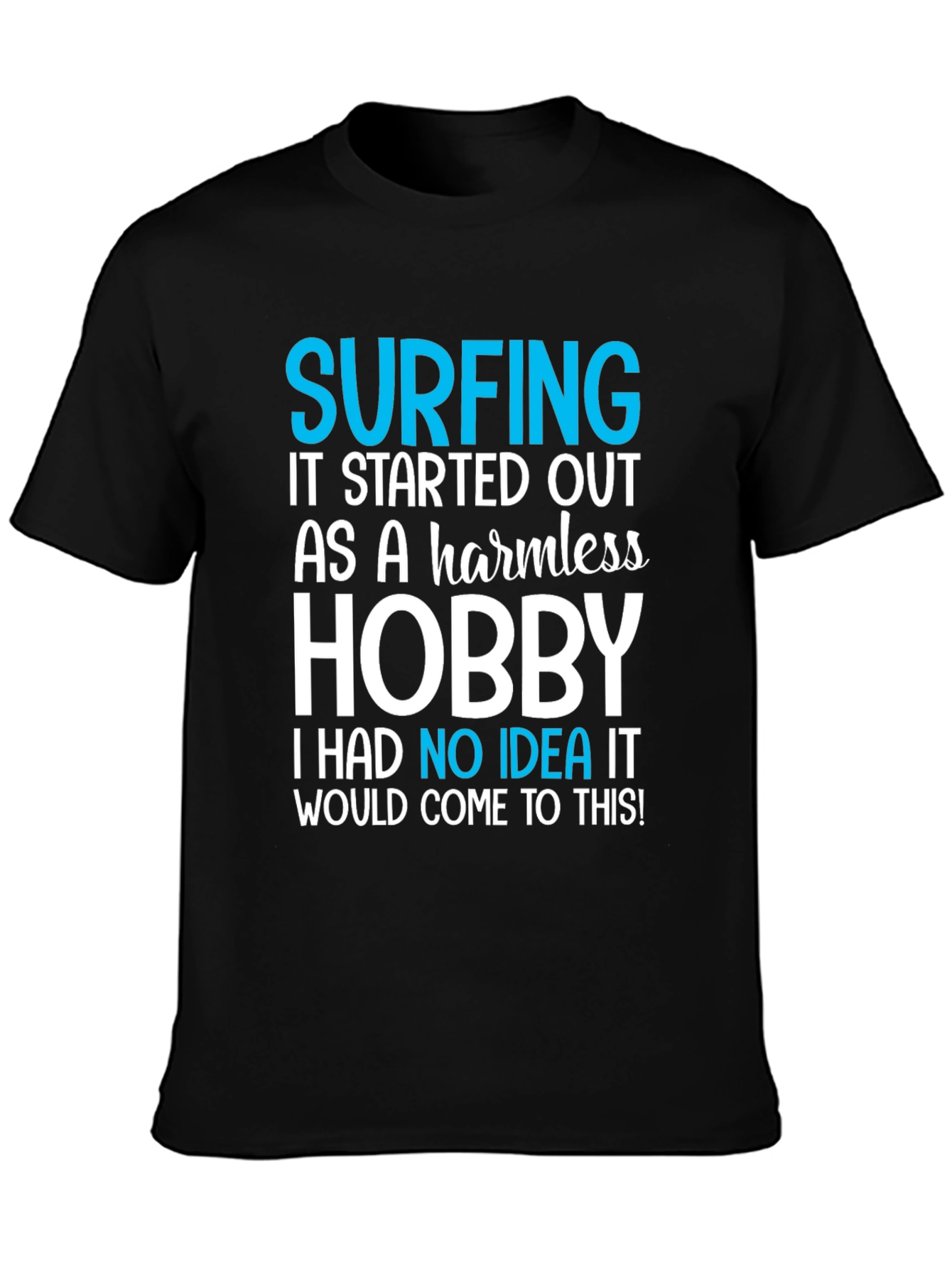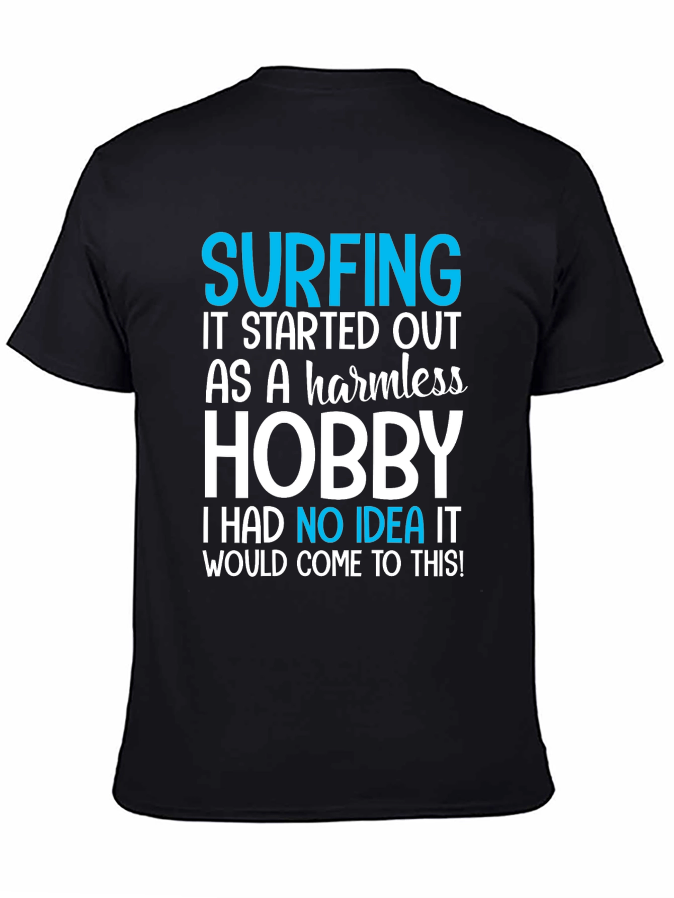 This black t-shirt features a playful and relatable graphic design. The text "SURFING IT STARTED OUT AS A harmless HOBBY I HAD NO IDEA IT WOULD COME TO THIS!" is prominently displayed in a mix of blue and white lettering. Made from a comfortable-looking cotton fabric, this tee is ideal for casual wear. The shirt's design is perfect for surfers or anyone who loves the beach lifestyle. Its lighthearted message makes it a great conversation starter. Whether you're hitting the waves, hanging out with friends, or just relaxing at home, this t-shirt is a fun and stylish choice. Show off your love for surfing with this unique and eye-catching tee!
